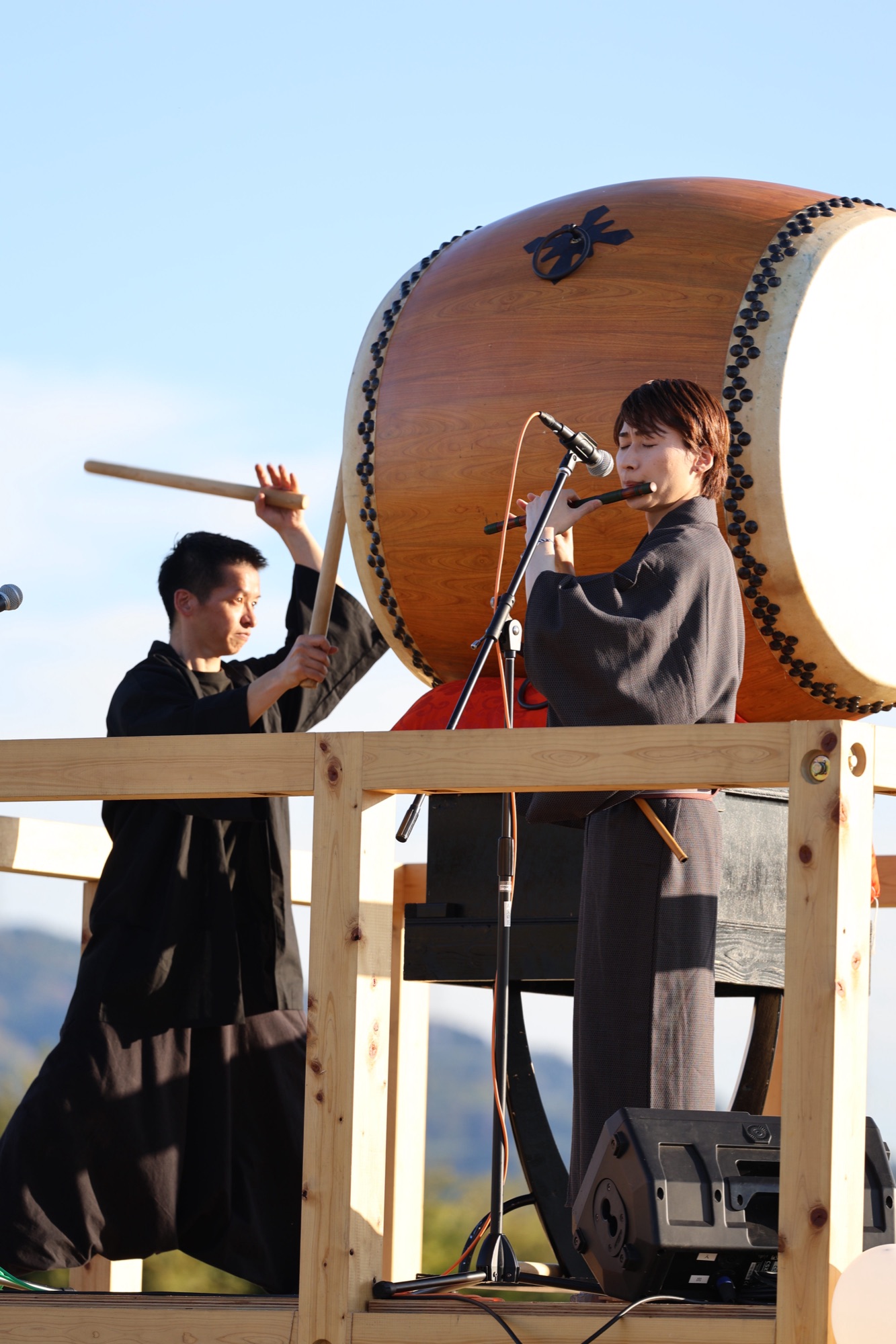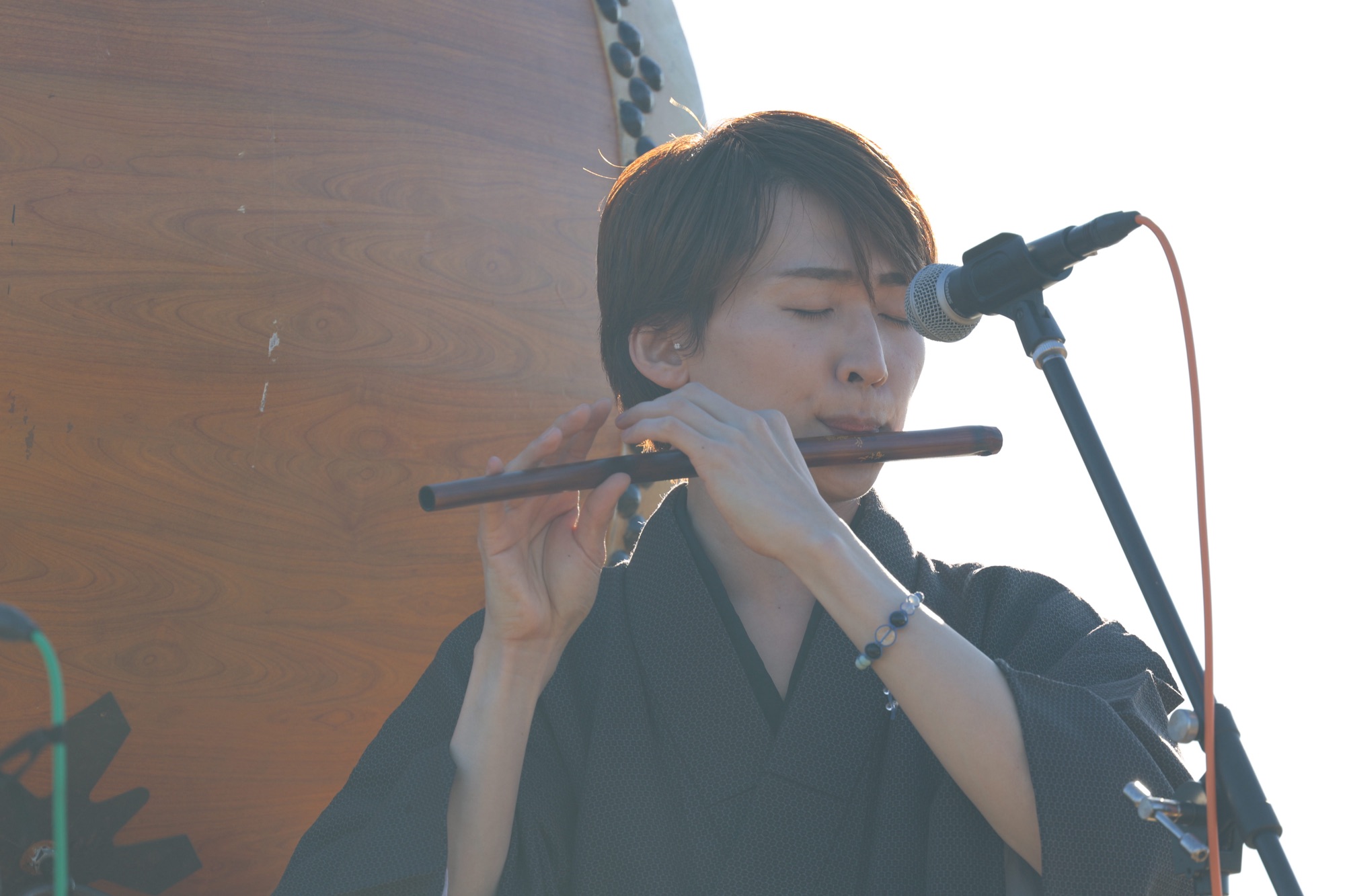 盆踊りステージのオープニングとクロージング演奏を、和太鼓奏者の福田久人氏とともに担当いたしました。