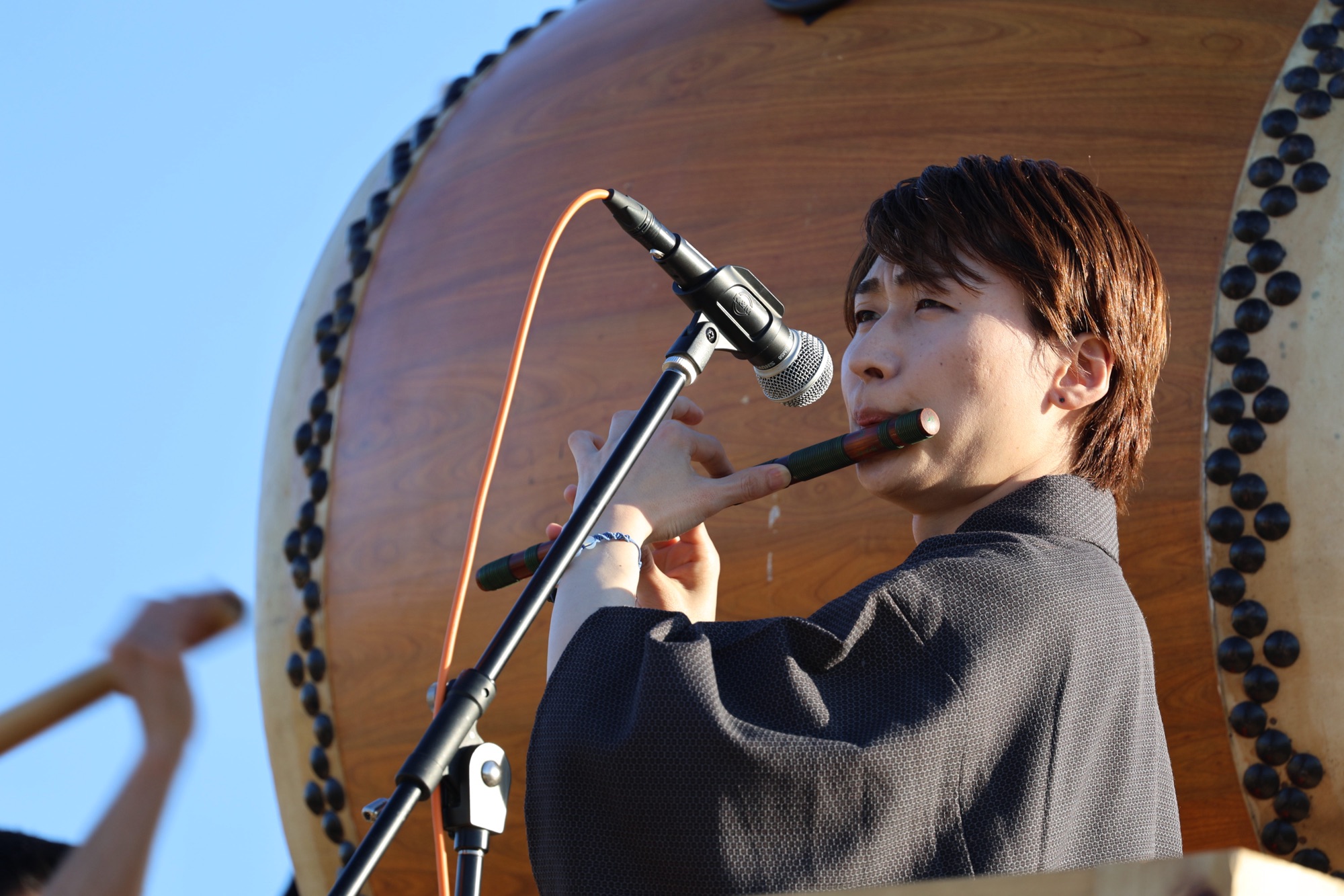 盆踊りステージのオープニングとクロージング演奏を、和太鼓奏者の福田久人氏とともに担当いたしました。